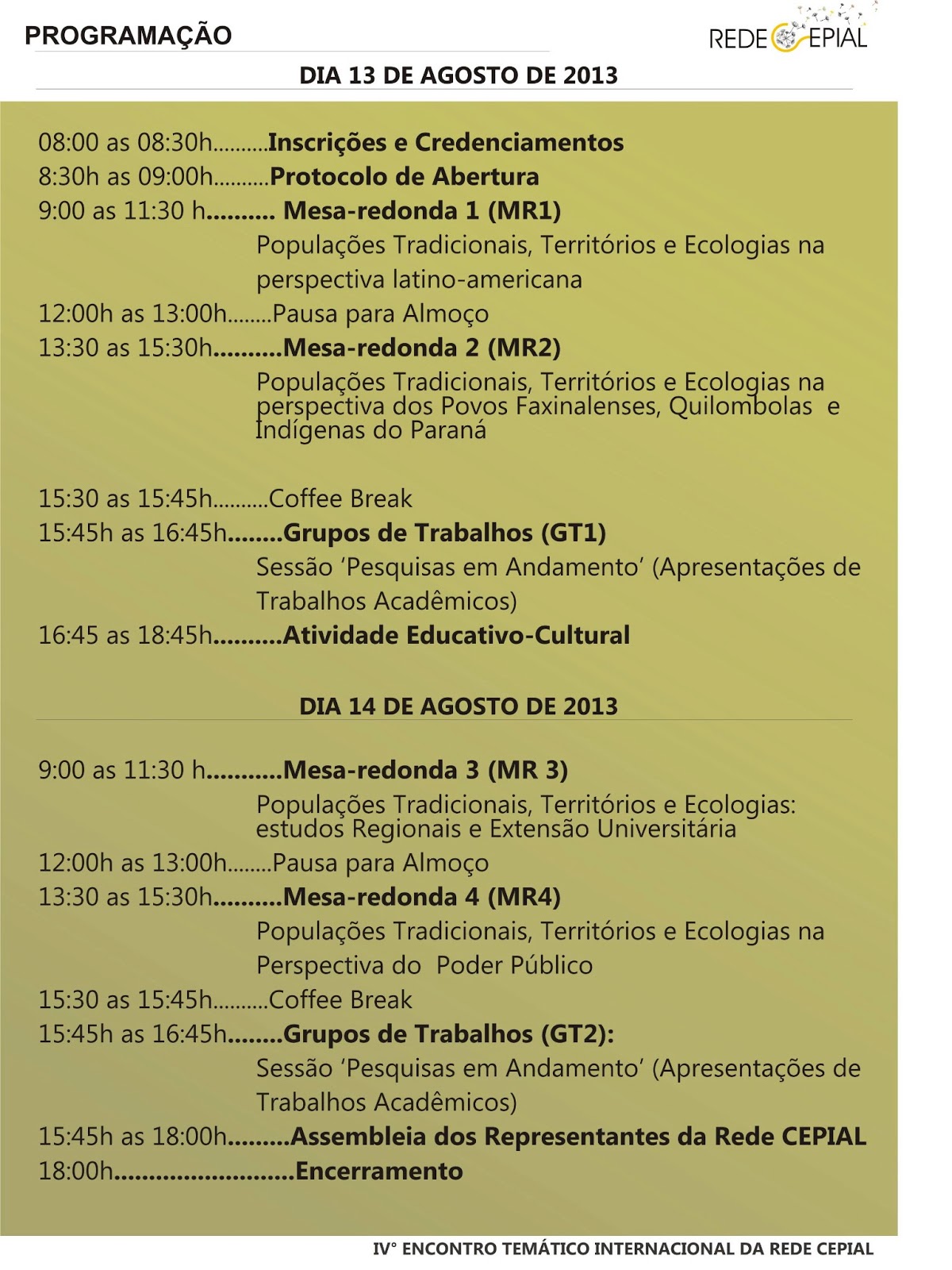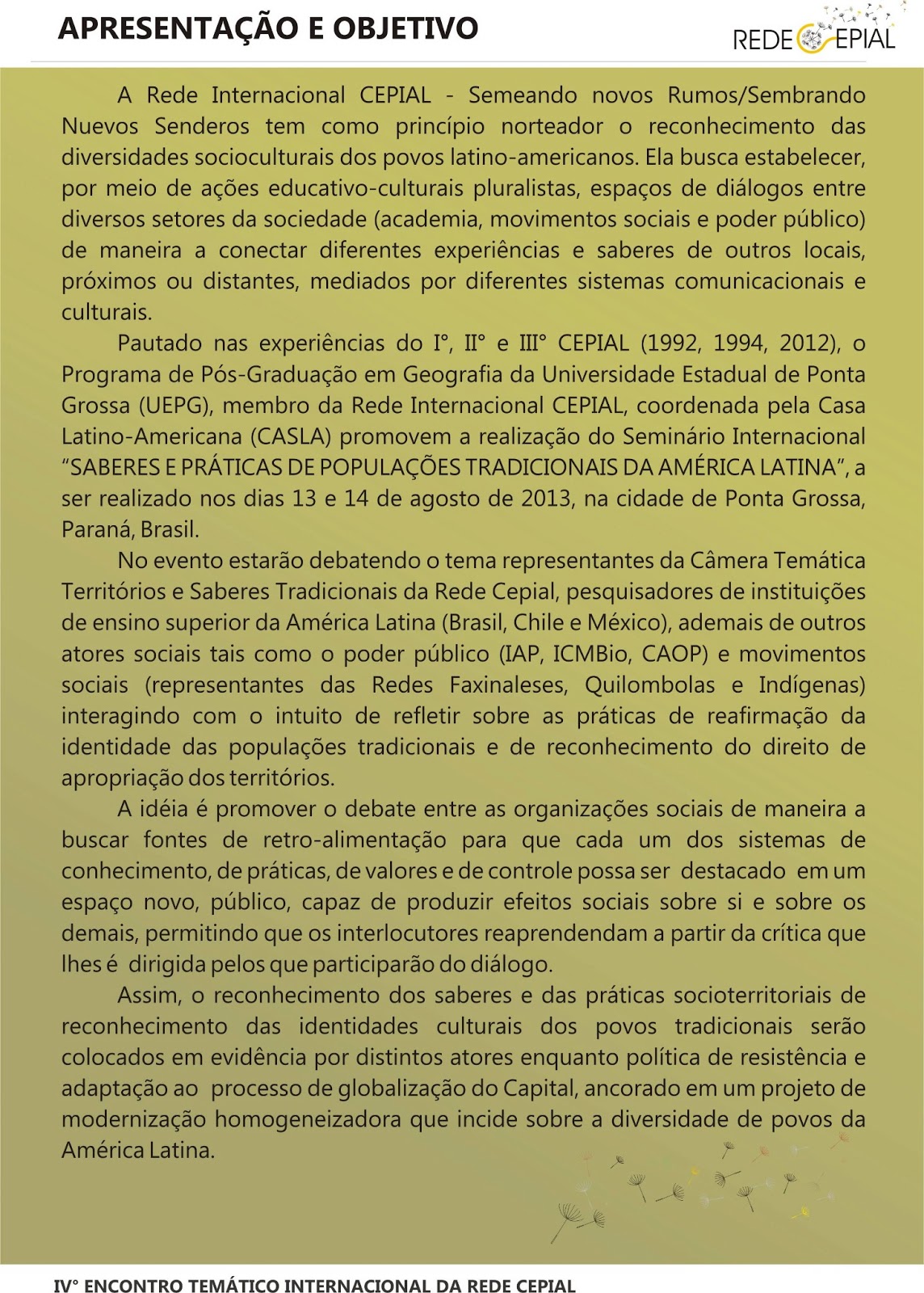 IV ENCONTRO TEMÁTICO DA REDE CEPIAL: SABERES E PRÁTICAS DE POPULAÇÕES TRADICIONAIS DA AMÉRICA LATINANotícias, Sem categoria / Por Rede Internacional CEPIAL