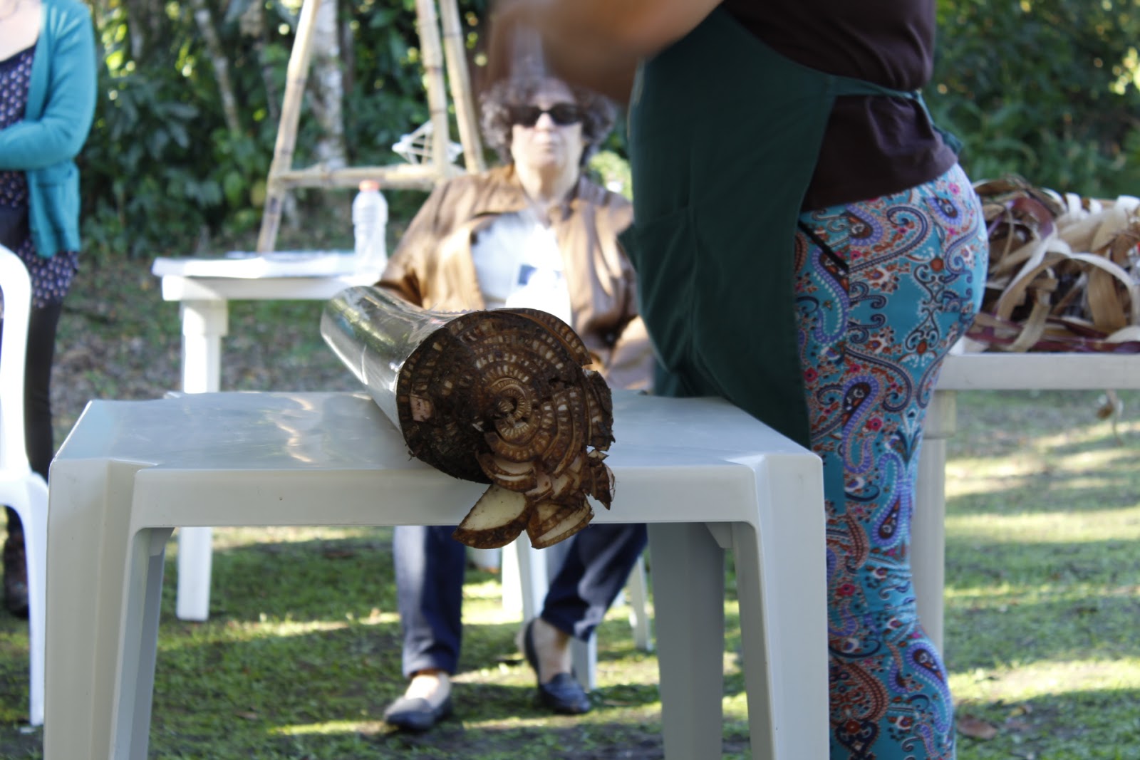 Oficinas participativas foram ofertadas, como a de bambu artesanal (Foto 09) – por Wilson Rubens/Instituto de Permacultura Ecovia São Miguel -, e a de fibras de bananeira. Ambas potencializaram o uso de materiais locais, e, a diversidade de adereços e peças que podem ser feitas com uma única matéria prima.