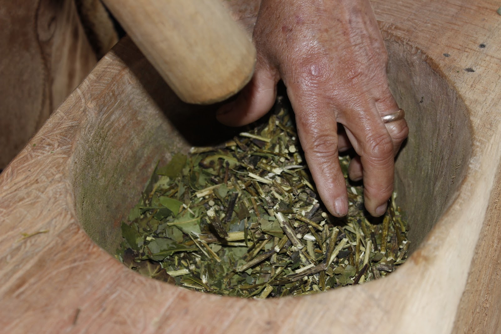 Todavia, segundo Stadler (2018) destaca-se durante as Oficinas as práticas culturais. Em uma delas a faxinalense Srª Jesuvina Chagas Ferreira, de 69 anos, moradora do local há mais de 25 anos, demonstra a tradição de socar a erva-mate no pilão, uma atividade que realiza todos os anos em sua propriedade (Foto 03). Ela corta a erva-mate, seca no forno de barro e soca no pilão, de modo artesanal e tradicional. E a prática da “Paçoca de carne” no pilão, apresentada pela família Chagas, onde se coloca a carne de porco salgada junto a farinha de milho e vai socando até formar a paçoca (Foto 04).